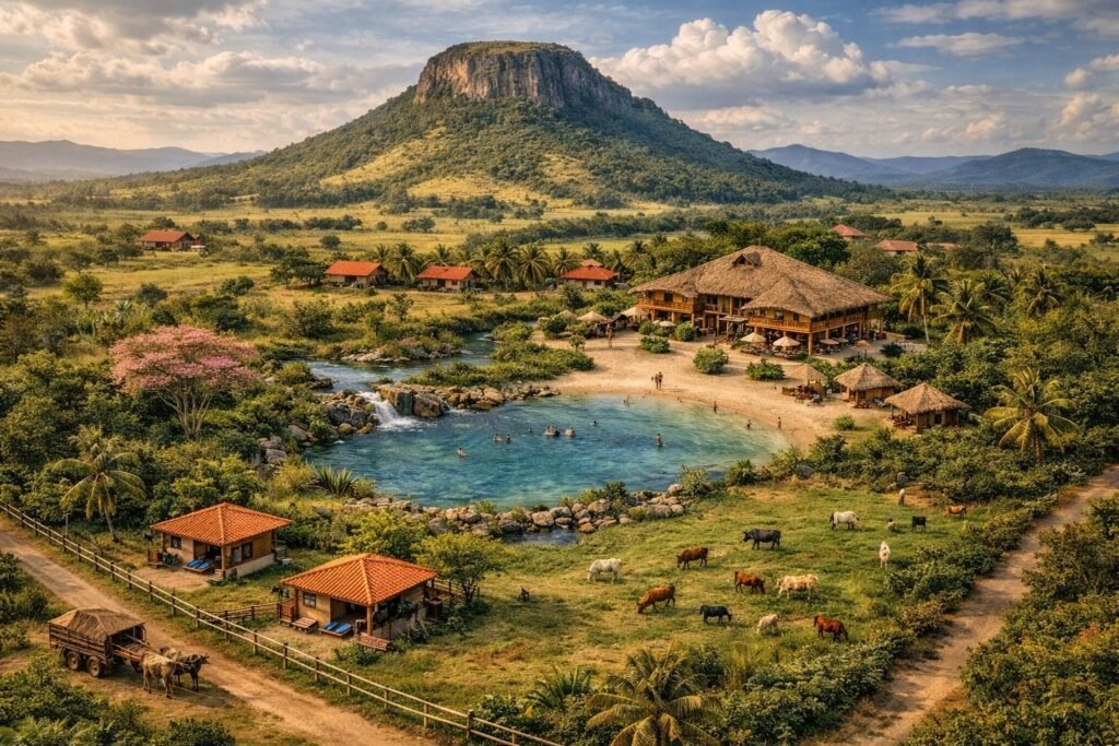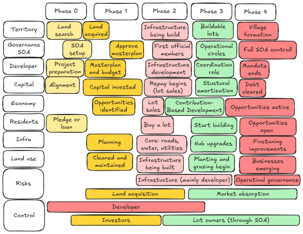 Early phases are coordinated by the GranjaLotes developer, while the long-term village structure is held by the Shared Ownership Association (SOA).
